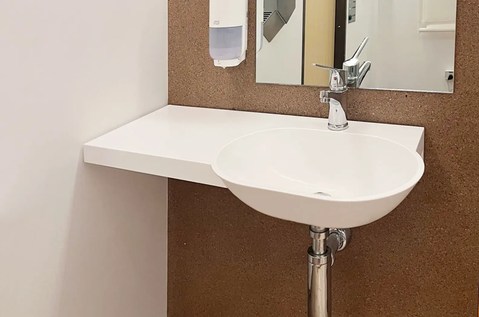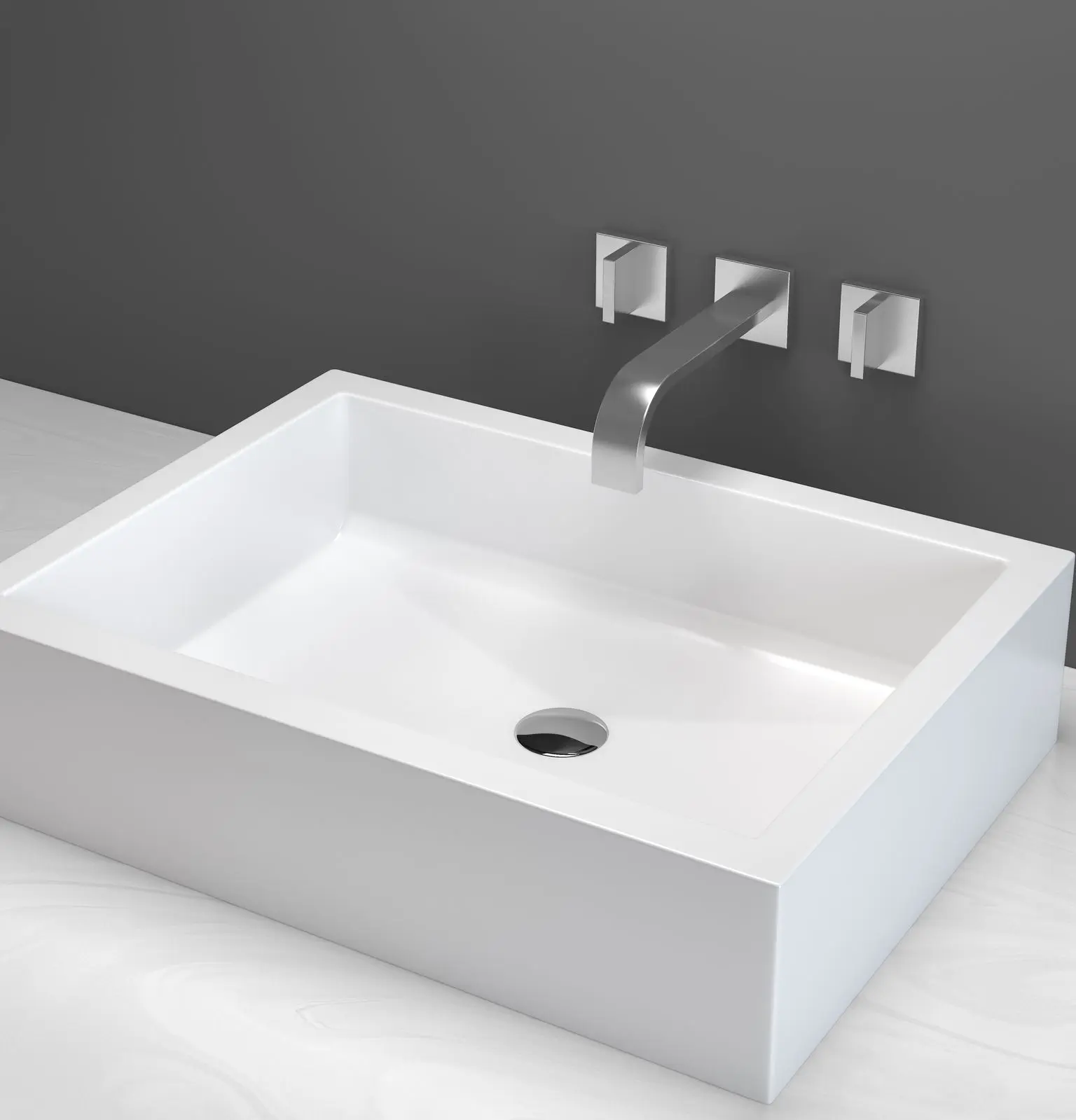 我们是以可丽耐实体面材为主材,设计和生产多种接纳,存储,引导水流的产品,包括全系列的实体面材,厨房台面和水盆、商用通长水槽、医疗和适老用一体台盆等产品。