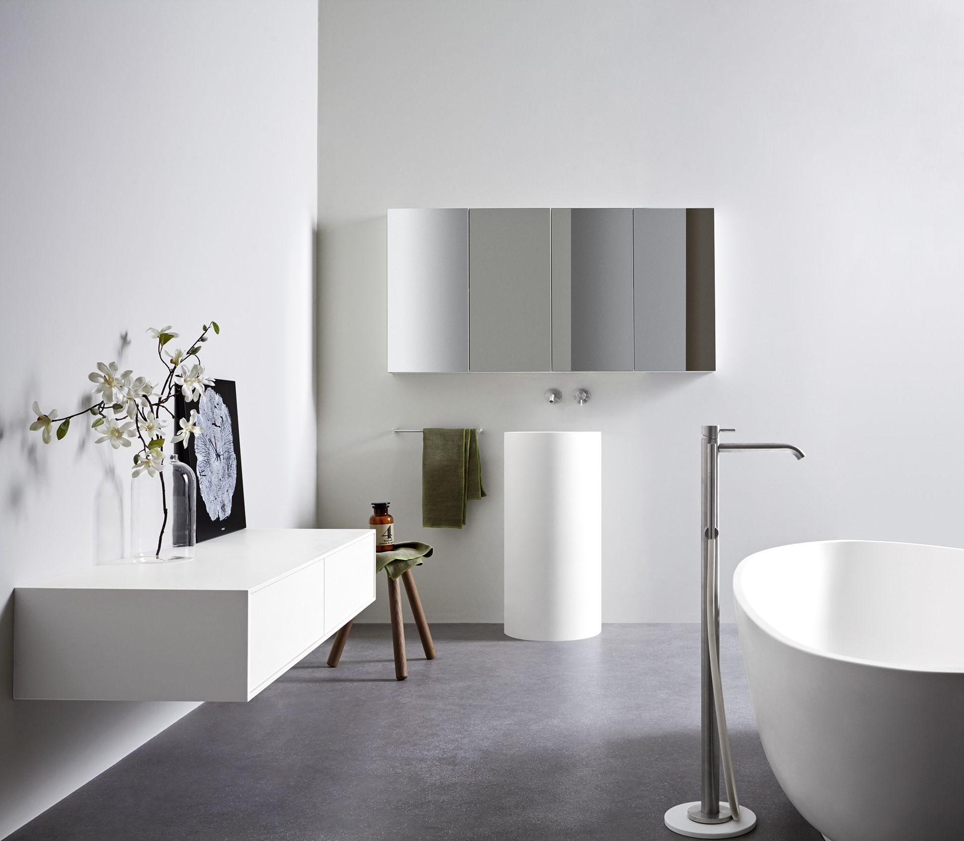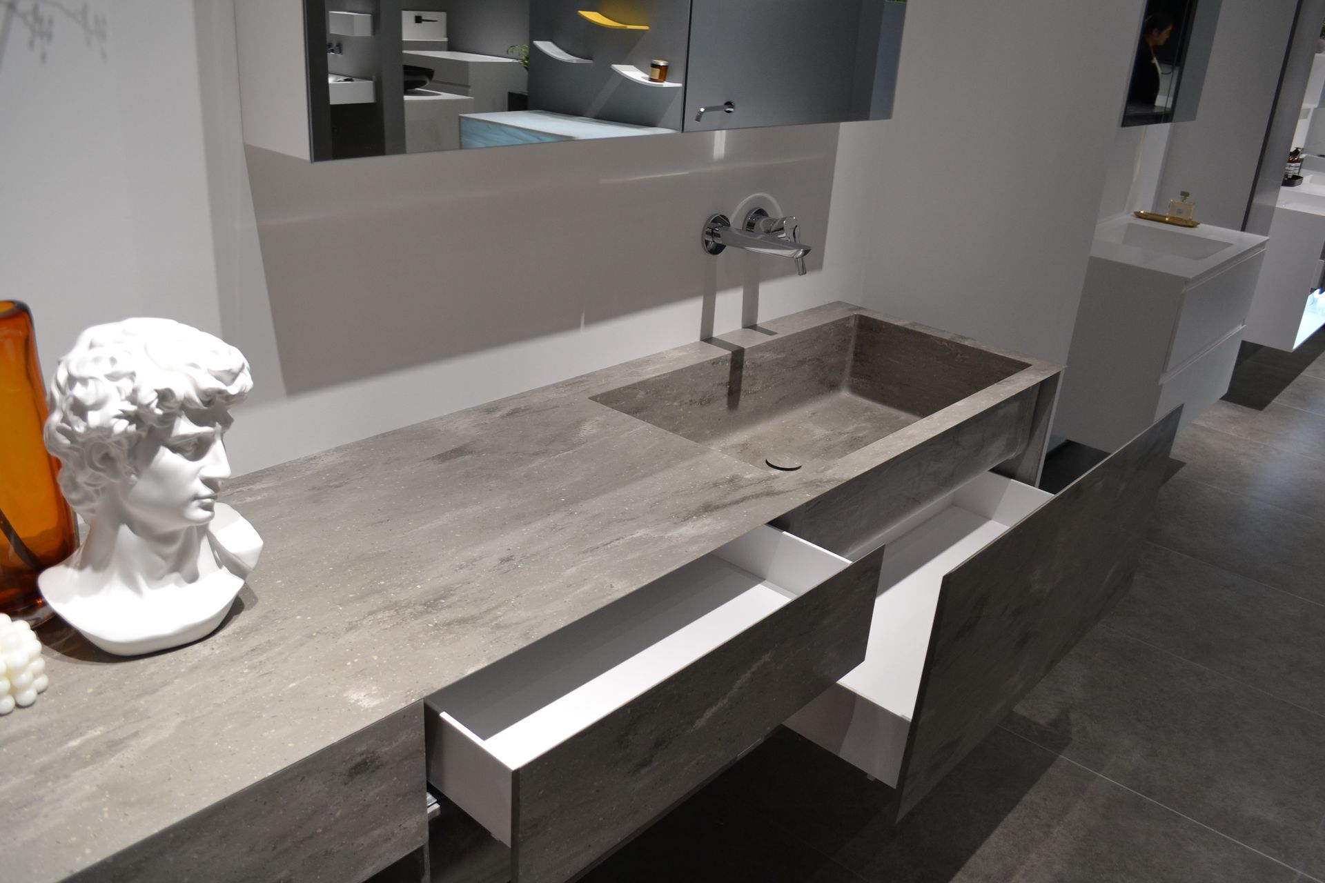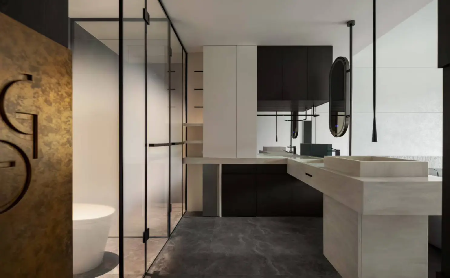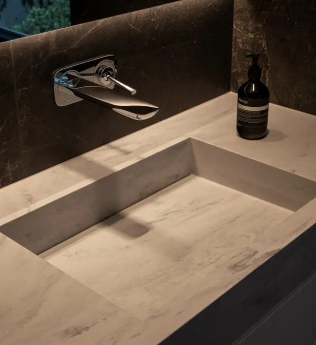 一体浴室柜,采用杜邦可丽耐(Corian)材质,台面与柜体无缝一体成型,尽显高端质感。
